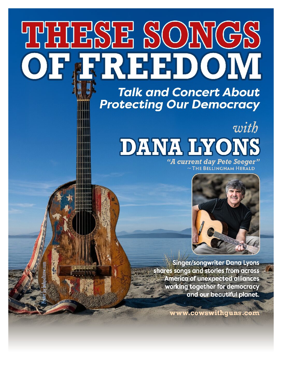 Singer/songwriter Dana Lyons shares songs and stories from across America about unusual alliances coming together to work for democracy and our beautiful planet.
